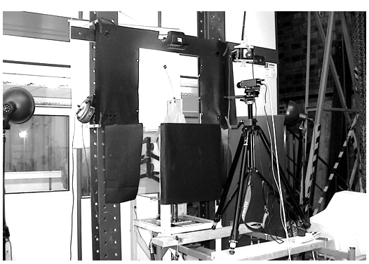Experiment byl proveden v rámci výzkumného pobytu na partnerské univerzitě Bauhaus-Universität Weimar v Německu. Vybraná konstrukce byla umístěna do prostředí vhodného pro optické snímání videokamerou, viz Obr. 1. Konce prutu a vybrané body z nepohyblivého okolí označovaly reflexní štítky. K rozpoznávání jejich polohy ze získaného videozáznamu sloužil speciální software. Celá experimentální sestava je zobrazena na Obr. 3.