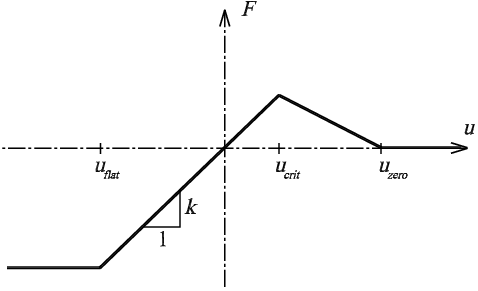 Model tlačeného vzorku tvaru je tvořen hmotnými body, které v sobě koncentrují jeho hmotnost. Tyto body na sebe navzájem působí prostřednictvím sítě interakčních pružin s definovanou silovou funkcí. Přístup se podobá netradičním výpočetním metodám, kterými jsou částicové modely a příhradové „lattice“ modely. Vlastnosti interakční funkce souvisí s fyzikálními vlastnostmi materiálu a volbou sítě hmotných bodů a pružin. Pro modelování tlačeného vzorku z cementové malty je vybrána interakční funkce užívaná pro vystižení kvazikřehkých materiálů. Lineární chování je omezeno v tlačené oblasti konstantní hodnotou odpovídající maximální tlakové síle v pružině, viz obr. 2; v tažené oblasti je po dosažení kritického posunutí (resp. maximální tahové síly) použita lineární sestupná závislost až do dosažení nulové hodnoty tahové síly. Poté je pružina považována za přetrženou. Odlehčení probíhá paralelně se vzestupnou větví.