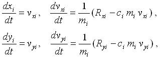 kde xi a yi jsou souřadnice i-tého hmotného bodu, vxi, vyi jsou složky aktuální rychlosti, Rxi, Ryi jsou složky aktuální výslednice interakčních sil Ri = f(u), kterou pružiny působí na hmotný bod, mi je jeho hmotnost, ci je součinitel útlumu a t je čas. Tato soustava je řešena základními numerickými metodami (Euler, Runge-Kutta).